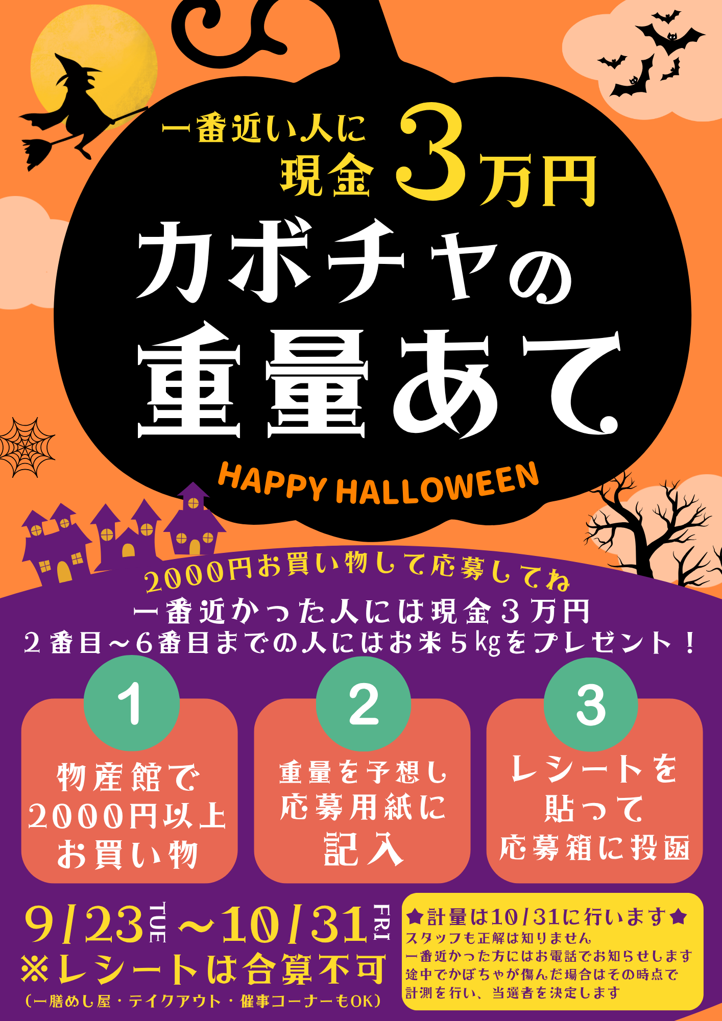 ただいま武雄温泉物産館では、ハロウィン恒例の人気イベント「カボチャの重量あてクイズ」を開催しています。
