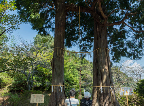 境内にある「夫婦円満縁結びのカシの木」は、モチの木とカシの木が寄り添うように立つ不思議な姿が特徴です。